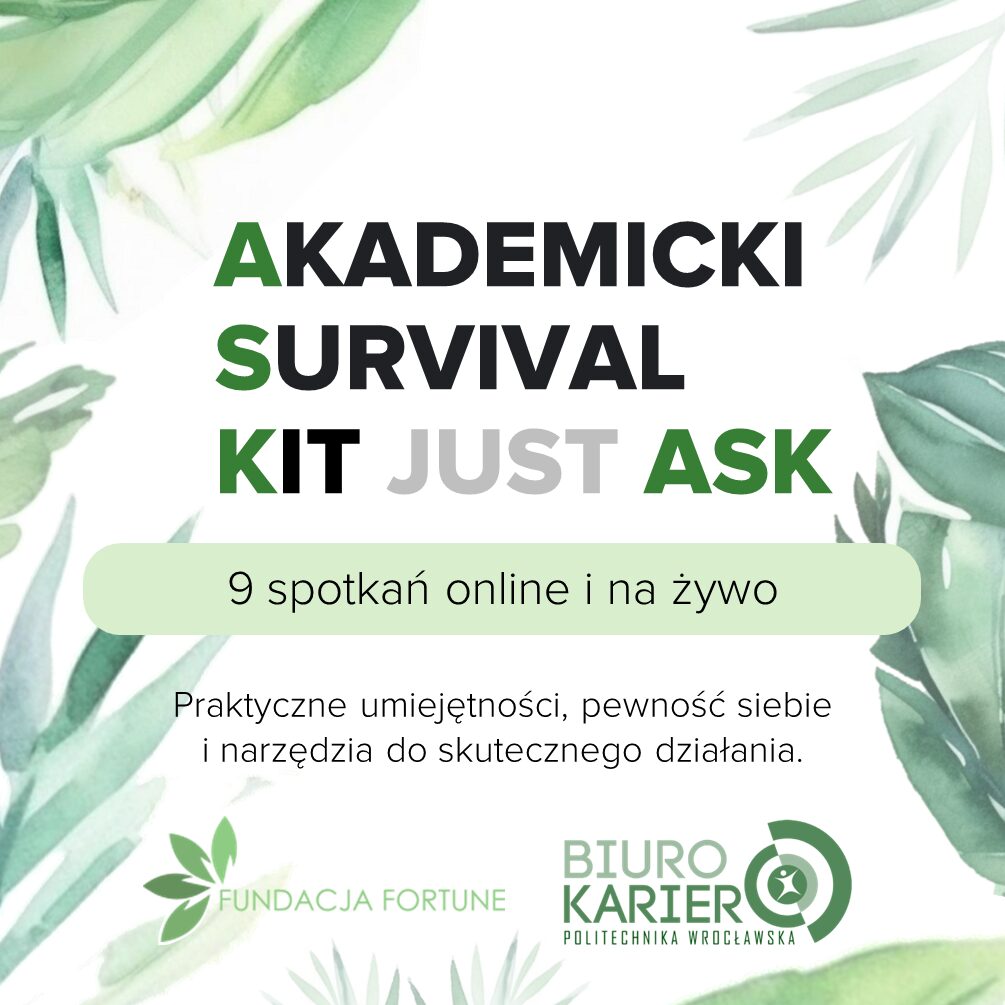 Serdecznie zapraszamy do udziału w cyklu warsztatów AKADEMICKI SURVIVAL KIT realizowanego przez Fundację Fortune we współpracy z Biurem Karier Politechniki Wrocławskiej.
