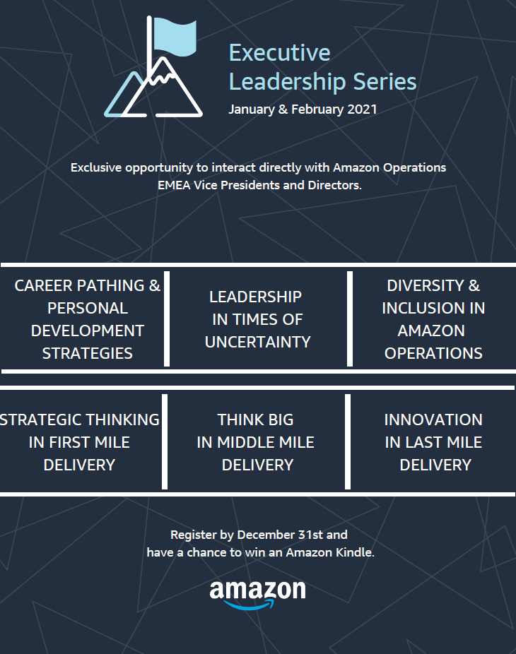 | Accelerate Your Growth with Amazon Operations’ Executive Leadership Series! We are very proud to launch the Executive Leadership Seriesled by Amazon Operations Vice-Presidents and Directors. This is an exclusive opportunity for you to learn more about Amazon Operations through the eyes of some of our most Senior Leaders in Europe and to interact with them. They will cover topics ranging from career pathing, diversity & inclusion to leadership in times of uncertainty and the strategies and innovations that will pave the future of logistics & transportation. |
