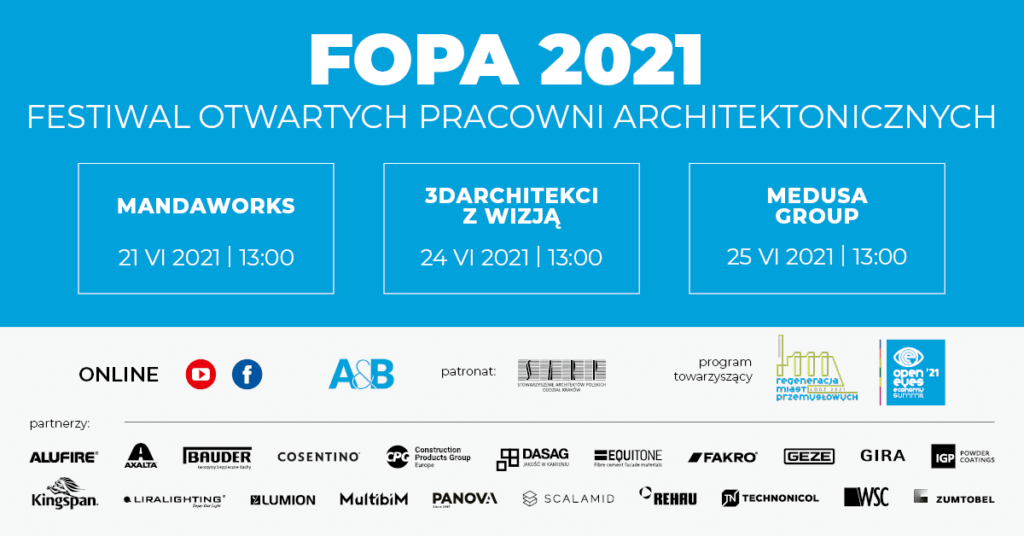 Już 21 czerwca zapraszamy Was na wiosenną edycję Festiwalu Otwartych Pracowni Architektonicznych FOPA 2021. W programie przygotowane są 3 dni spotkań w pracowniach architektonicznych, zarówno z Polski, jak i z zagranicy, do których zaprosimy Was dzięki transmisji online na Facebooku i YouTubie. Festiwal to świetna okazja do poznania najlepszych biura architektonicznych od kuchni, przyjrzenia się ich metodzie projektowej i badawczej oraz poznania najciekawszych architektów w ich środowisku pracy. Wiosenna edycja FOPY jest wydarzeniem towarzyszącym Międzynarodowego Kongresu Regeneracja Miast Przemysłowych — wspólnej inicjatywy Urzędu Miasta Łodzi oraz Open Eyes Economy, o którym możecie przeczytać w najnowszym wydaniu A&B. Udział w festiwalu jest bezpłatny!