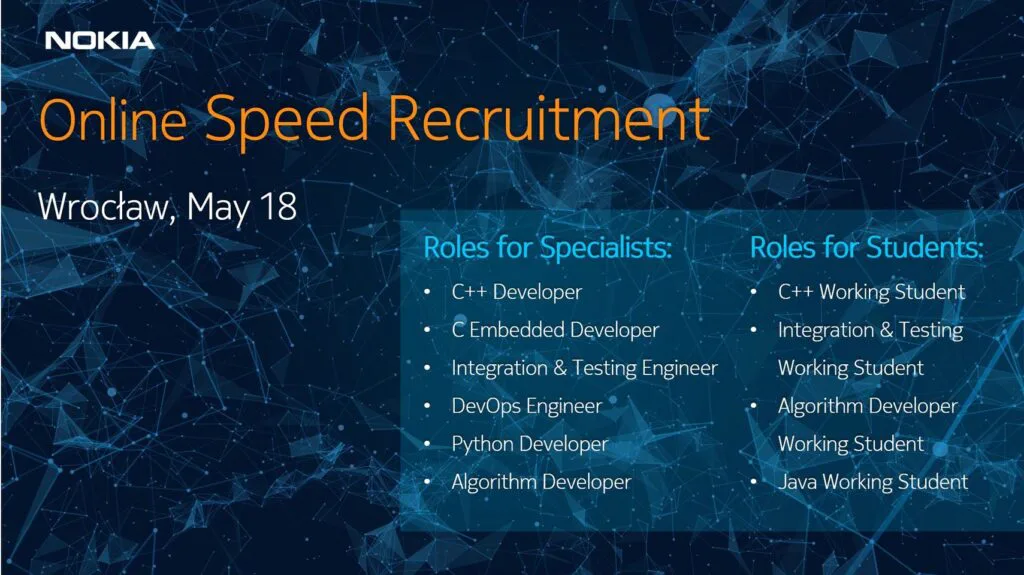 We would like to invite you to attend the ONLINE Speed Recruitment event at Nokia Wrocław!During the 15 minutes’ session, you will have a possibility to check your skills and knowledge in one of the following: