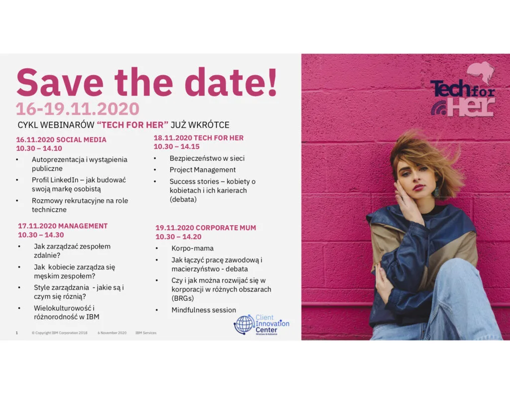 O wzmacnianiu pozycji kobiet w IT wiele się mówi, ale od mówienia lepsze są czyny! IBM Client Innovation Centre organizuje właśnie pierwszą edycję serii webinarów Tech for Her. Co to jest? To seria szkoleń, porad i dyskusji skierowanych do kobiet które chcą rozpocząć swoją karierę w IT.