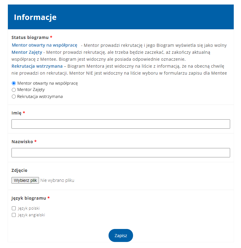 Po wypełnieniu Biogramu należy poczekać na zatwierdzenie go przez administratora.