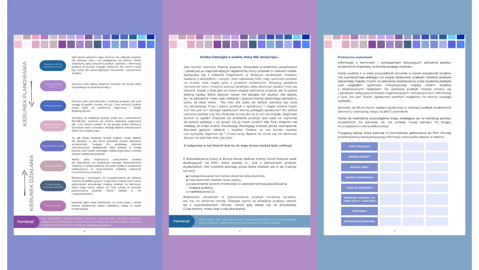 w odpowiedzi na potrzeby studentów i studentek Politechniki Wrocławskiej. Zawiera wskazówki doradczyń kariery dotyczące procesu planowania szukania praktyk studenckich oraz metody poszukiwań.